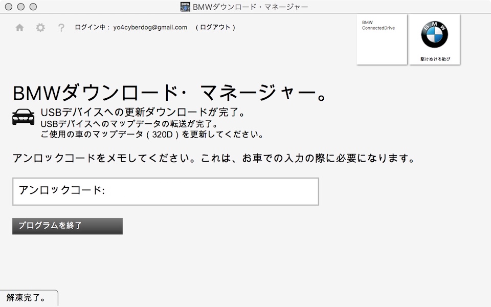 20分ぐらいして見たら完了していました。SSDで約20分です。展開が完了すると“アンロックコード”が表示されますので念のため記録しておきます。このコードはダウンロードを開始した時点でメールにて配信されます。